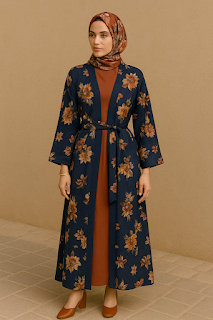 A navy blue abaya with floral prints in rust and cream tones. Styled open with a matching belt, worn over a rust inner dress. Paired with block heels and a scarf that matches the floral tones. Gold bangles add extra flair.